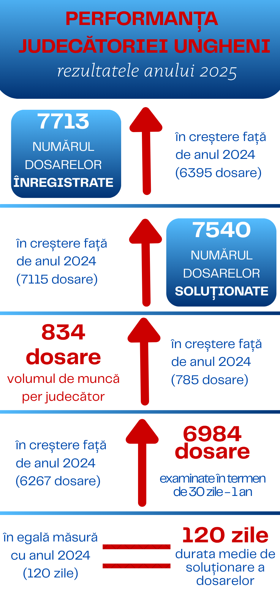 Știați că, în anul 2025, Judecătoria Ungheni a înregistrat un număr total de 7713 dosare, ceea ce reprezintă o creștere de 20,6% față de aceeași perioadă a anului 2024.